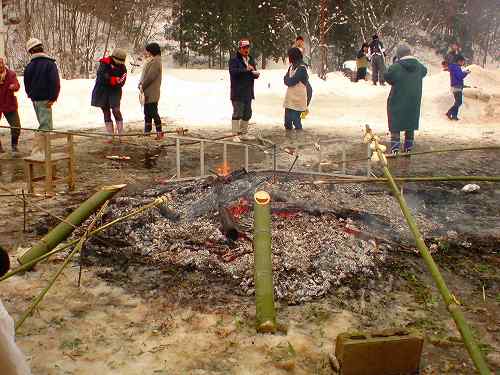 火が落ちてきたら、お餅を焼いて、竹酒をあっためて…