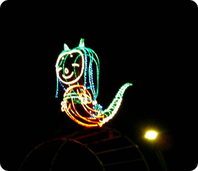 色鮮やかな電飾で作られた龍姫が暗闇に浮かんでます。
